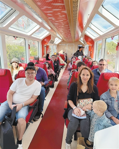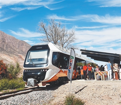 This group of photos focuses on the "inaugural journey of the new-energy light rail train," capturing a historic moment in China-Argentina cooperation. The visual elements showcase both the strength of "Made in China" and humanity's shared pursuit of green development. The white train body contrasts with orange mountain contours, canyon scenery fills ultra-wide-angle viewing windows, and red seats complement locally inspired ceiling patterns inside the carriages. Moving beyond a simple engineering record, these photos provide a multidimensional interpretation of China-Argentina new-energy cooperation, serving as testimony to the deepening friendship between the two nations along the railway tracks.