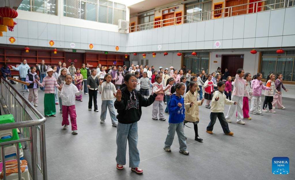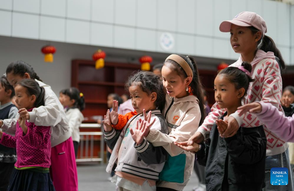 Children practice Tibetan opera at a public art center in Lhasa, southwest China's Xizang Autonomous Region, Sept. 14, 2025.