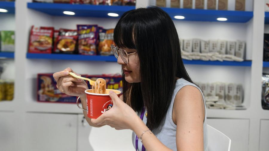 A visitor tastes Luosifen at a booth of the 22nd China-ASEAN Expo in Nanning, south China's Guangxi Zhuang Autonomous Region, Sept. 17, 2025. (Xinhua/Zhang Ailin)