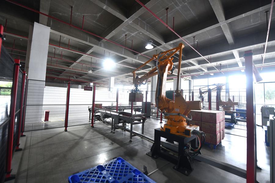 Robotic arms pack pre-package Luosifen at the warehouse of a company in Liuzhou, south China's Guangxi Zhuang Autonomous Region, Sept. 9, 2025. (Xinhua/Huang Xiaobang)