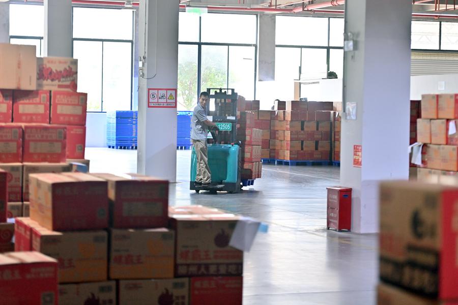 A staff member transports packs of pre-package Luosifen at the warehouse of a company in Liuzhou, south China's Guangxi Zhuang Autonomous Region, Sept. 9, 2025. (Xinhua/Huang Xiaobang)