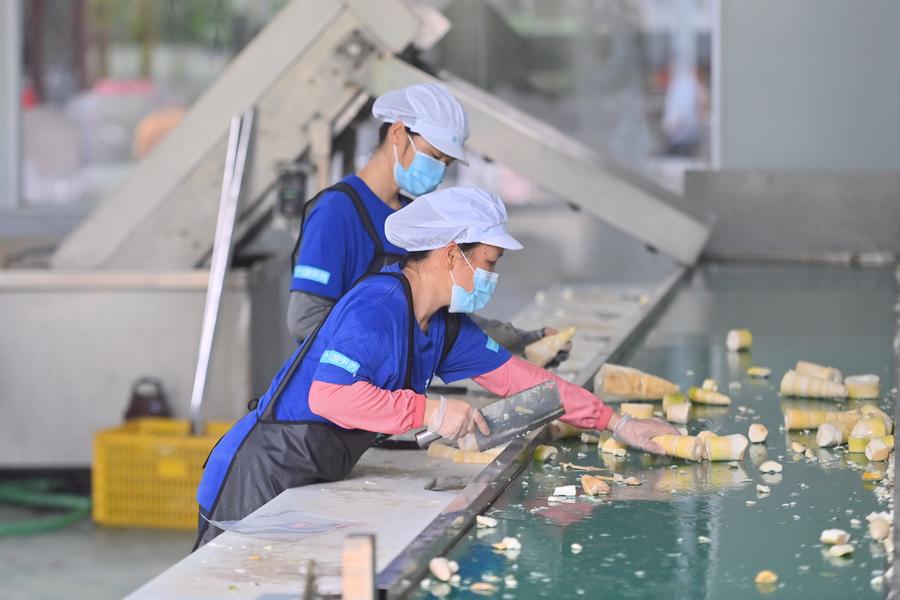 Staff members prepare raw ingredients for pickled bamboo shoots at the workshop of a company in Liuzhou, south China's Guangxi Zhuang Autonomous Region, July 11, 2025. (Photo by Zheng Changhao/Xinhua)