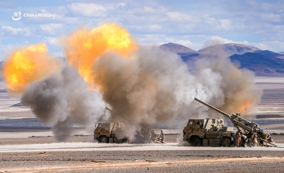 Two PCL-181 155mm wheeled self-propelled howitzers attached to a regiment under the Chinese PLA Xinjiang Military Command open fire simultaneously during a live-fire assessment in late August, 2025. (eng.chinamil.com.cn/Photo by Chen Jiliang and Liu Fasen)