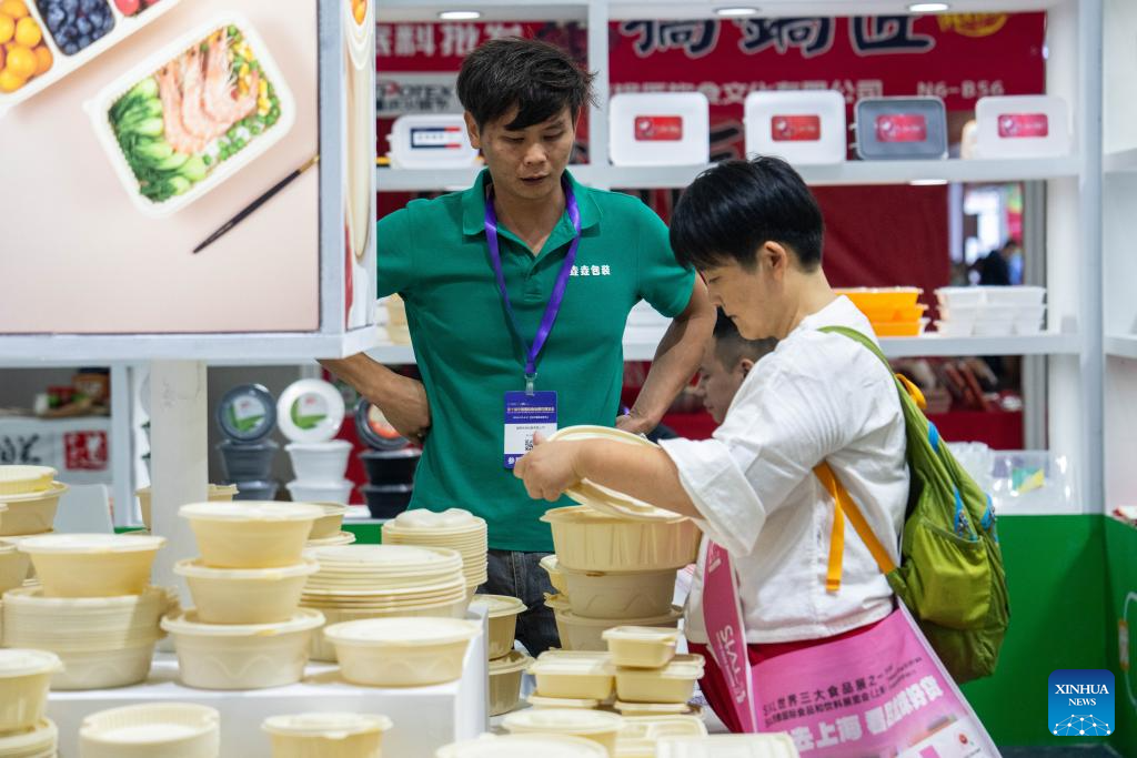 A visitor (R) learns about a disposable lunch box at the 10th China International Food &Catering Expo in Changsha, central China's Hunan Province, Sept. 19, 2025. The 10th China International Food &Catering Expo opened here on Friday, attracting over 1,400 enterprises to participate. (Xinhua/Chen Sihan)