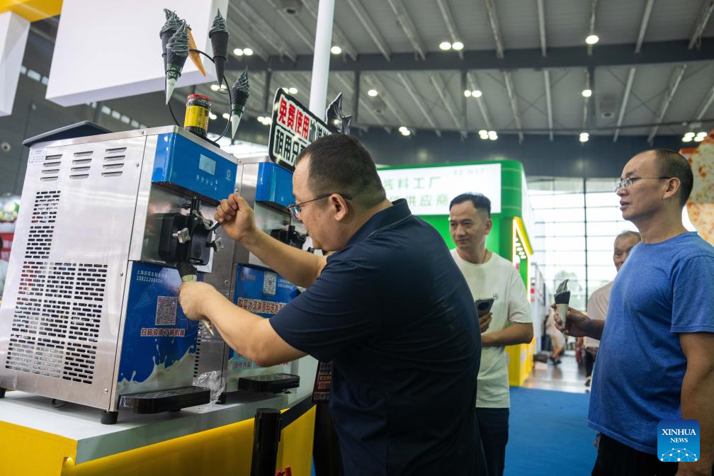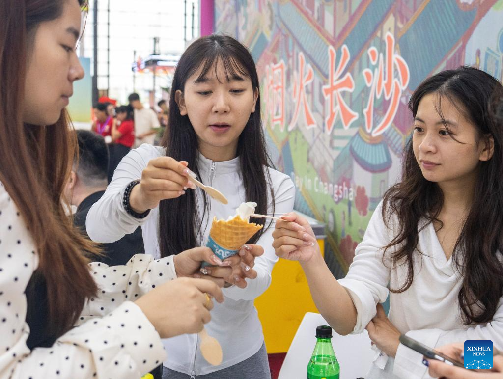 Visitors taste an ice cream at the 10th China International Food &Catering Expo in Changsha, central China's Hunan Province, Sept. 19, 2025. The 10th China International Food &Catering Expo opened here on Friday, attracting over 1,400 enterprises to participate. (Xinhua/Chen Sihan)