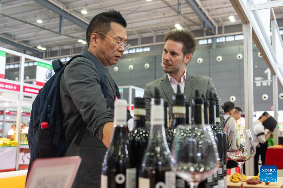 An exhibitor (R) introduces wine to a visitor at the 10th China International Food &Catering Expo in Changsha, central China's Hunan Province, Sept. 19, 2025. The 10th China International Food &Catering Expo opened here on Friday, attracting over 1,400 enterprises to participate. (Xinhua/Chen Sihan)