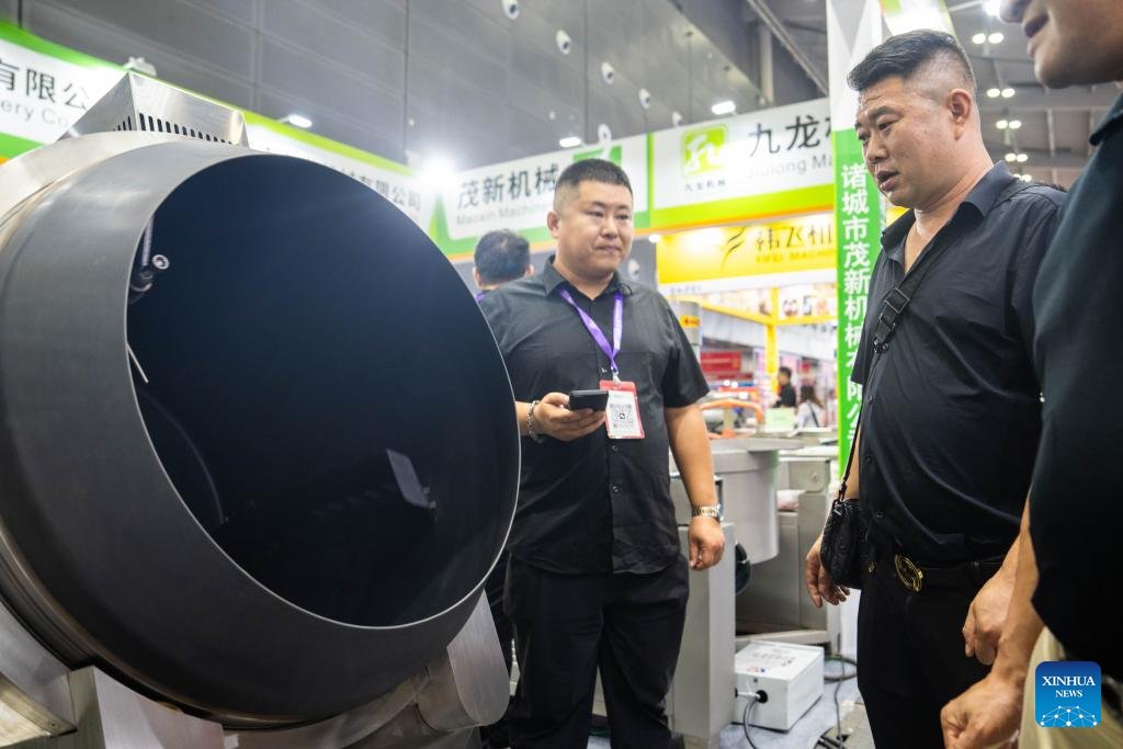 A visitor (R) learns about a commercial cooking machine at the 10th China International Food &Catering Expo in Changsha, central China's Hunan Province, Sept. 19, 2025. The 10th China International Food &Catering Expo opened here on Friday, attracting over 1,400 enterprises to participate. (Xinhua/Chen Sihan)