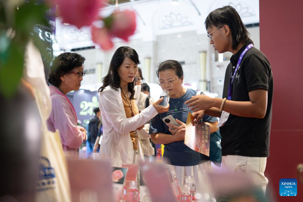 People learn about the floral preservation products at the 23rd Kunming International Flower Expo of China in Kunming, capital of southwest China's Yunnan Province, Sept. 19, 2025. The flower expo kicked off on Friday in Kunming, attracting more than 500 enterprises from around the world.