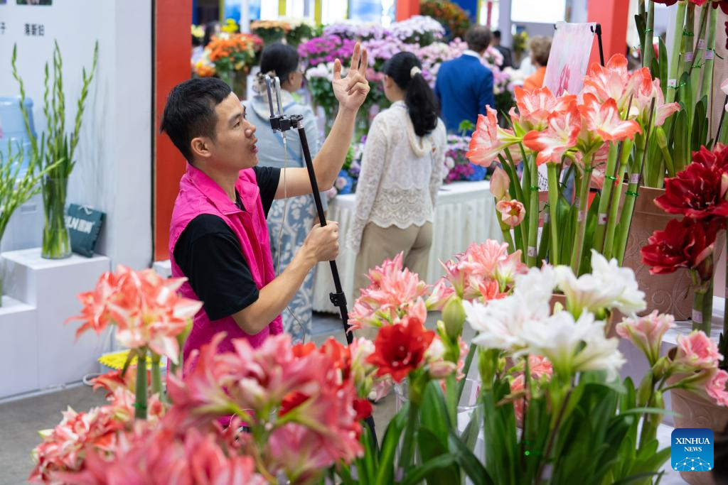 An exhibitor promotes flowers via livestream at the 23rd Kunming International Flower Expo of China in Kunming, capital of southwest China's Yunnan Province, Sept. 19, 2025. The flower expo kicked off on Friday in Kunming, attracting more than 500 enterprises from around the world.