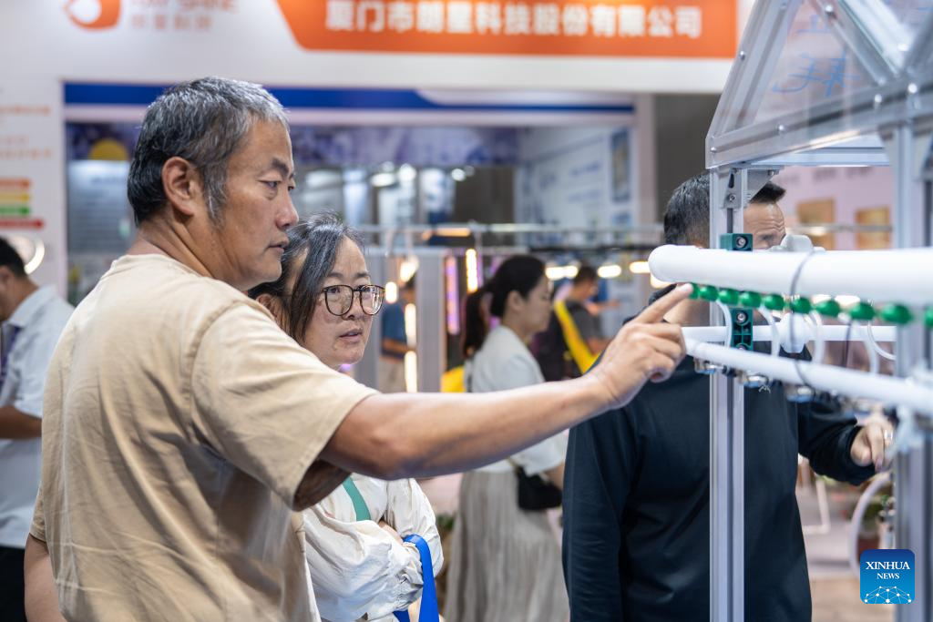 People learn about the greenhouse mist equipment at the 23rd Kunming International Flower Expo of China in Kunming, capital of southwest China's Yunnan Province, Sept. 19, 2025. The flower expo kicked off on Friday in Kunming, attracting more than 500 enterprises from around the world.