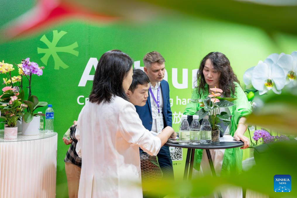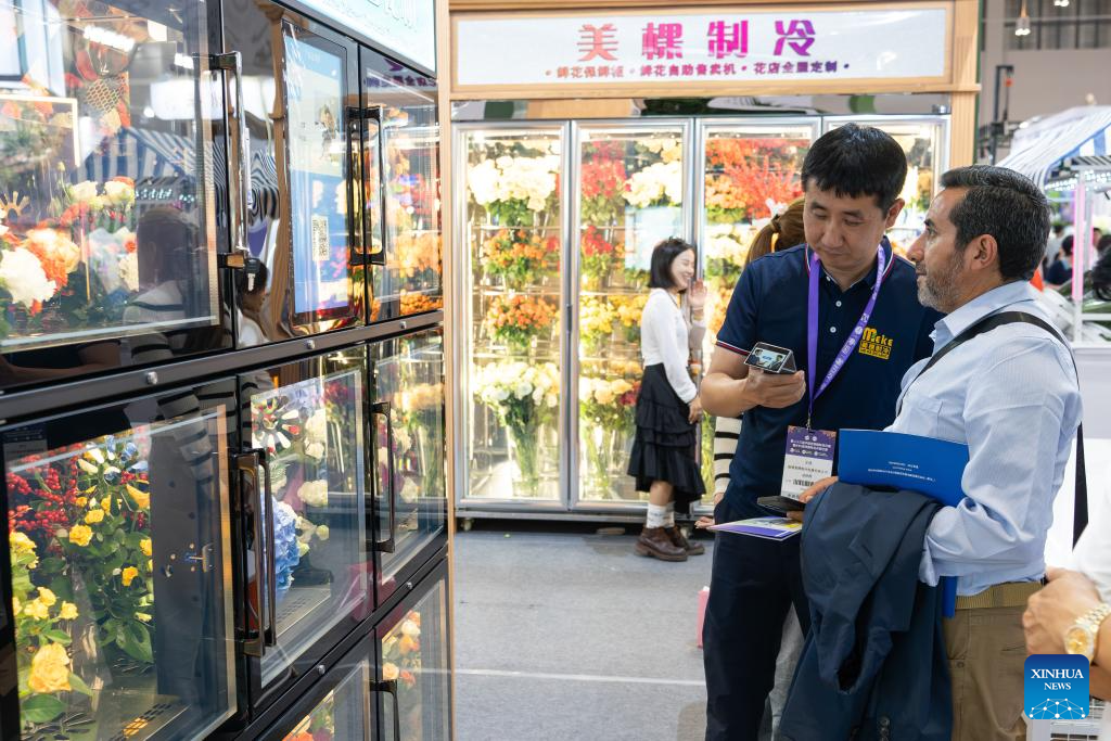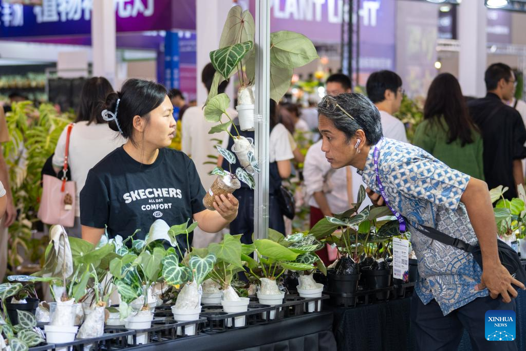 Merchants discuss business during the 23rd Kunming International Flower Expo of China in Kunming, capital of southwest China's Yunnan Province, Sept. 19, 2025. The flower expo kicked off on Friday in Kunming, attracting more than 500 enterprises from around the world.