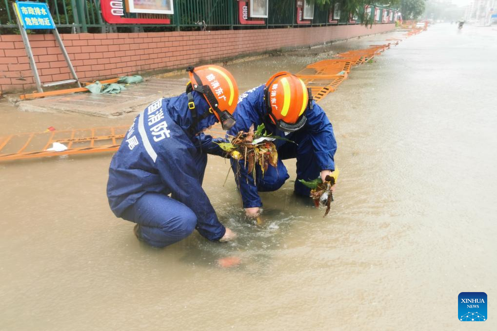 Rescuers work on a waterlogged road in Shanwei, south China's Guangdong Province, Sept. 19, 2025. Typhoon Mitag, the 17th typhoon of this year, made landfall in south China's Guangdong Province at about 2:50 p.m. Friday, according to the provincial meteorological observatory.