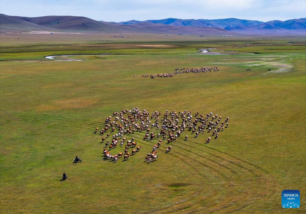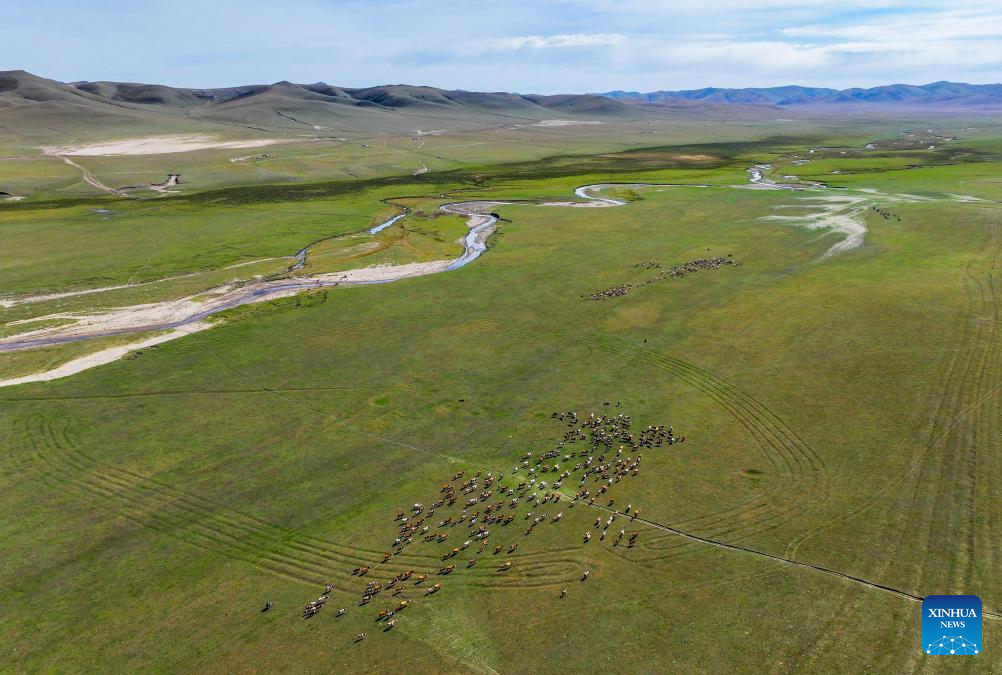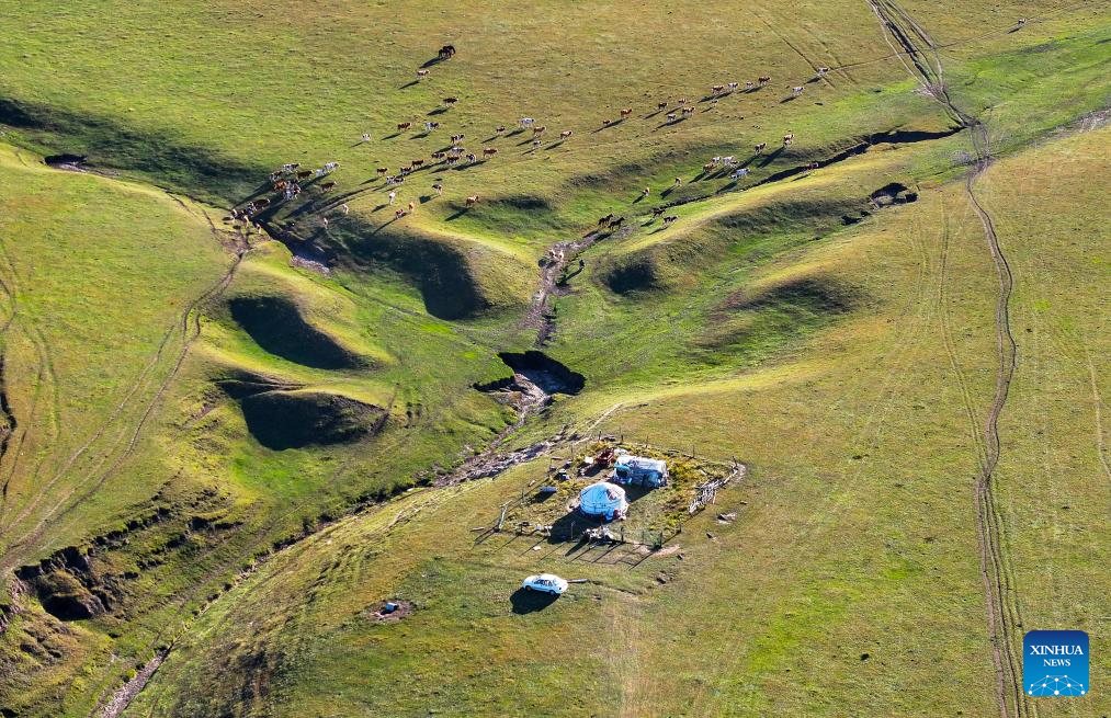 An aerial drone photo taken on Sept. 19, 2025 shows the summer pasture where Duurengbulag's family has stayed in Baori Hushu Gacha of Gerquluu Sumu, Jarud Banner of Tongliao, north China's Inner Mongolia Autonomous Region. Every September, herders in Baori Hushu Gacha of Gerquluu Sumu in Jarud Banner drive their well-fed livestock from the summer pastures back to the winter pasture. (Xinhua/Lian Zhen)