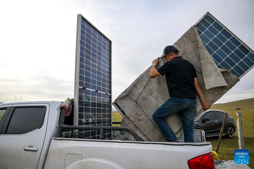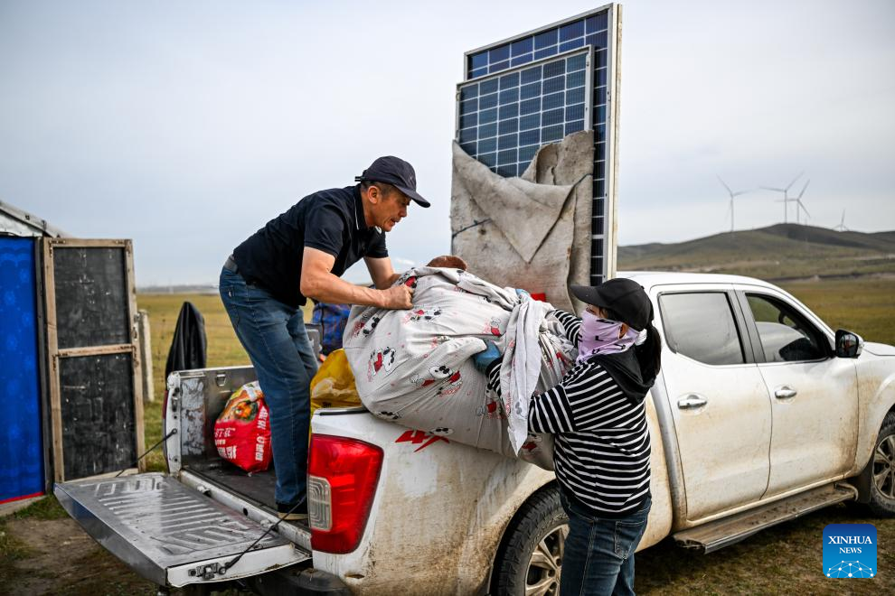 Duurengbulag helps a neighbor load solar panels onto a pick-up truck in Baori Hushu Gacha of Gerquluu Sumu, Jarud Banner of Tongliao, north China's Inner Mongolia Autonomous Region, Sept. 20, 2025. Every September, herders in Baori Hushu Gacha of Gerquluu Sumu in Jarud Banner drive their well-fed livestock from the summer pastures back to the winter pasture. (Xinhua/Lian Zhen)