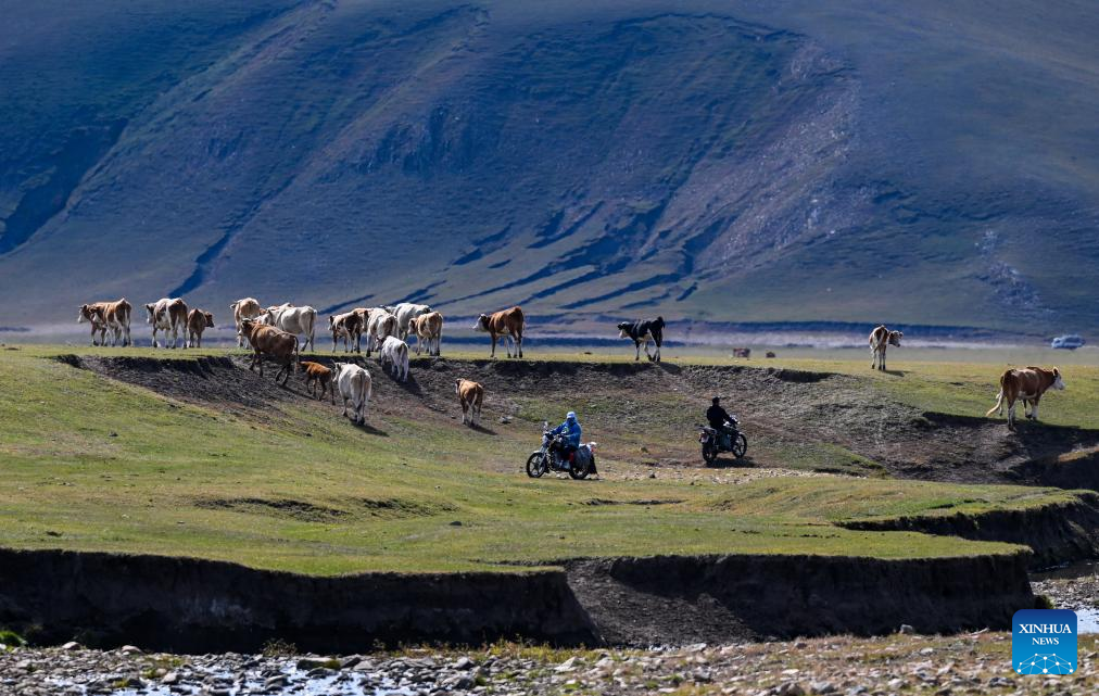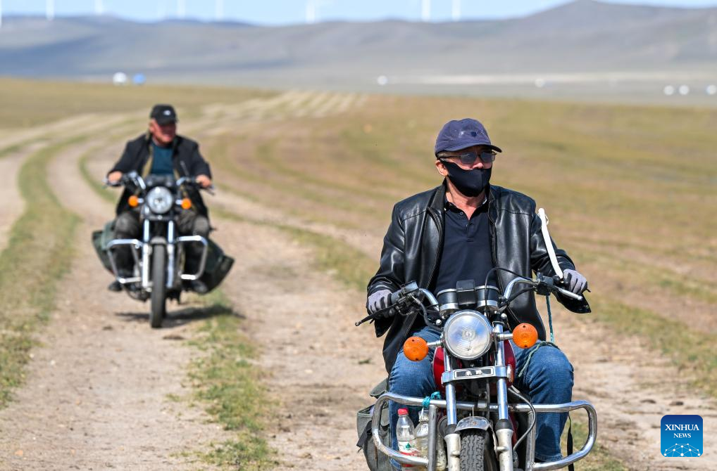 Duurengbulag and a neighbor ride motorcycles as they transfer livestock on their way home in Jarud Banner of Tongliao, north China's Inner Mongolia Autonomous Region, Sept. 20, 2025. Every September, herders in Baori Hushu Gacha of Gerquluu Sumu in Jarud Banner drive their well-fed livestock from the summer pastures back to the winter pasture. (Xinhua/Lian Zhen)