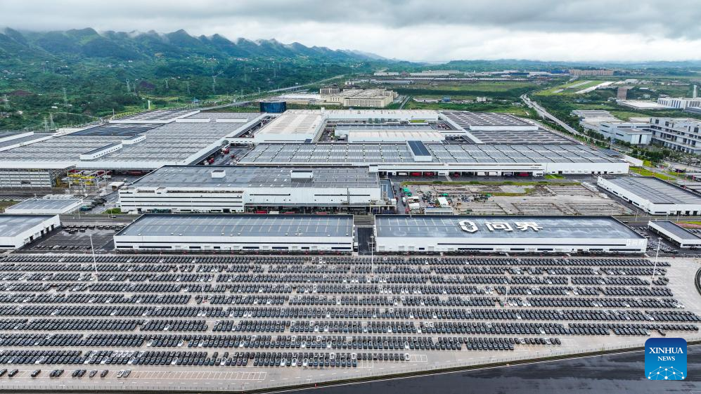 An aerial drone photo shows new energy vehicles at the Seres Super Factory in Liangjiang New Area, southwest China's Chongqing, Sept. 19, 2025. (Xinhua/Wang Quanchao)