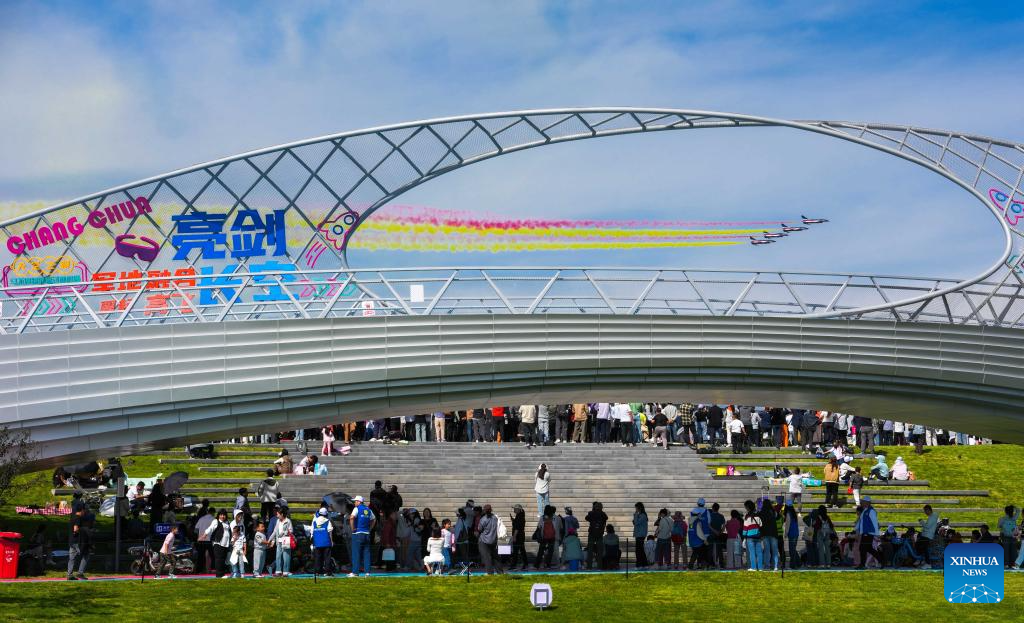 Visitors enjoy an aerobatic performance during the 2025 aviation open-day activities of the Chinese People's Liberation Army (PLA) Air Force and Changchun Air Show in Changchun, northeast China's Jilin Province, Sept. 20, 2025. The event is held here from Sept. 19 to 23, which comprehensively showcases the history and modernization of the PLA Air Force through aerobatic performances, equipment exhibitions, and various interactive activities. (Xinhua/Xu Chang)