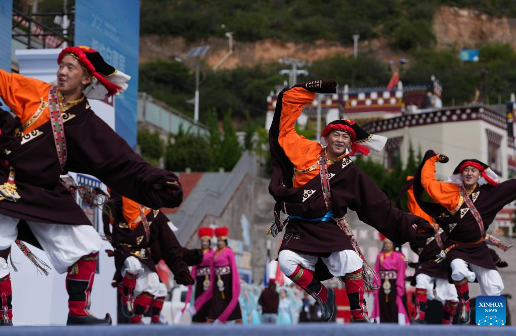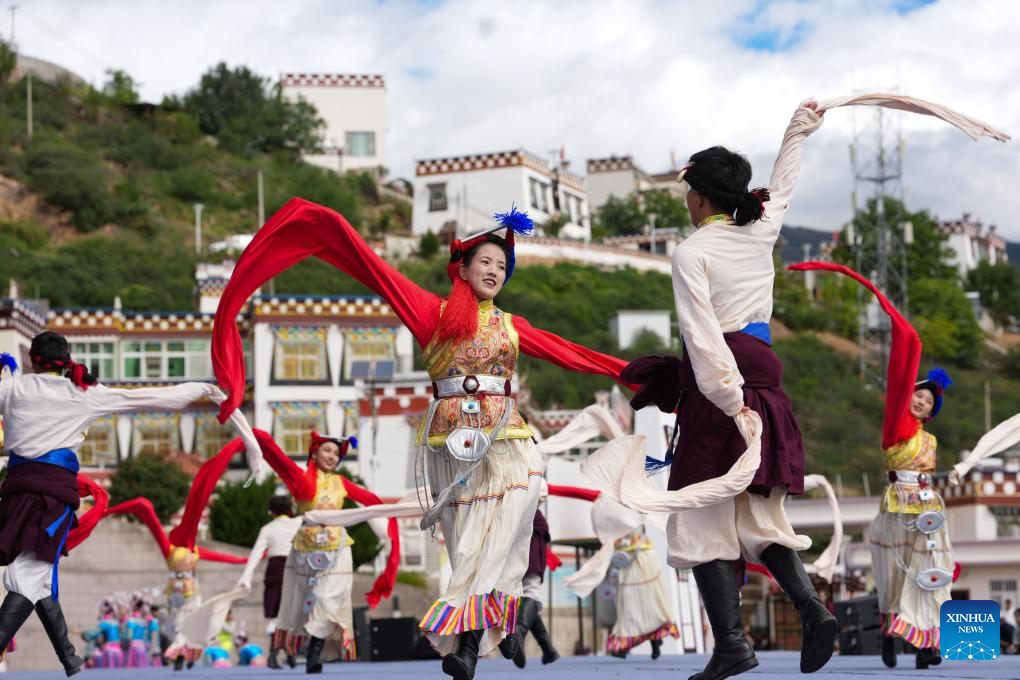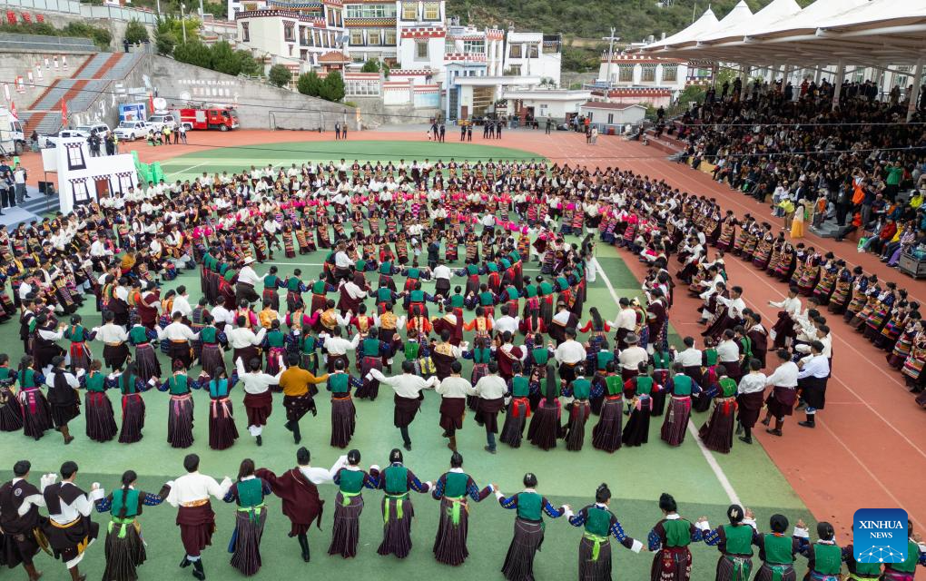 People enjoy Guozhuang dance, a traditional Tibetan square dance, during the opening ceremony of a whitewashing cultural week in Xiangcheng County, Ganzi Tibetan Autonomous Prefecture, southwest China's Sichuan Province, Sept. 20, 2025. A whitewashing cultural week started here on Saturday. Xiangcheng's whitewashed Tibetan houses preserve the core architectural style of the Kamba region. Each year, locals whitewash the exterior walls in a tradition known as the whitewashing ritual. (Xinhua/Jiang Hongjing)