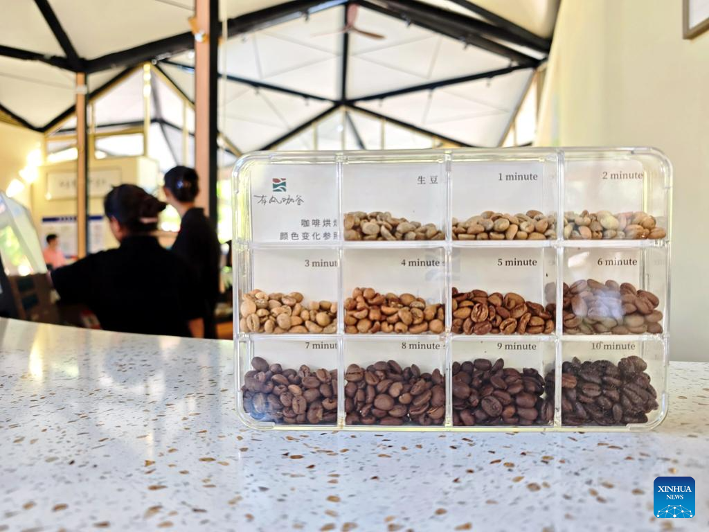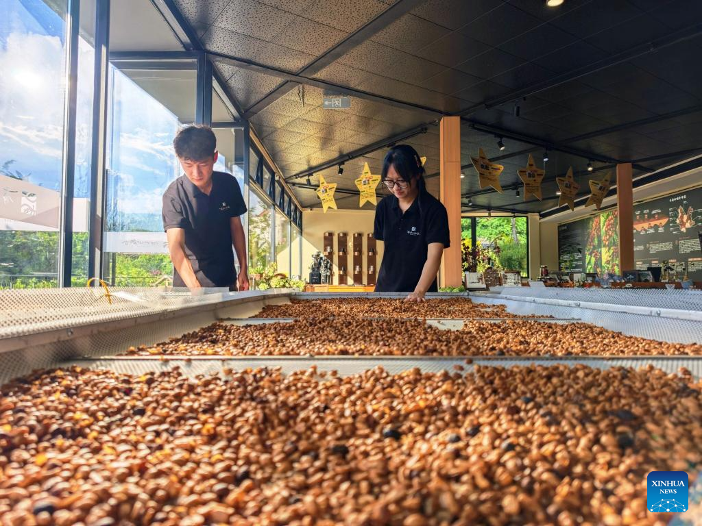 Staff members roast coffee beans at a coffee shop in Nandaohe Village, Simao District, Pu'er City, southwest China's Yunnan Province, Sept. 20, 2025. The city of Pu'er along the China-Laos Railway has fully leveraged its coffee resources and natural landscapes to provide visitors with coffee-themed tourism experience, boosting local rural revitalization. (Xinhua/Xing Guangli)