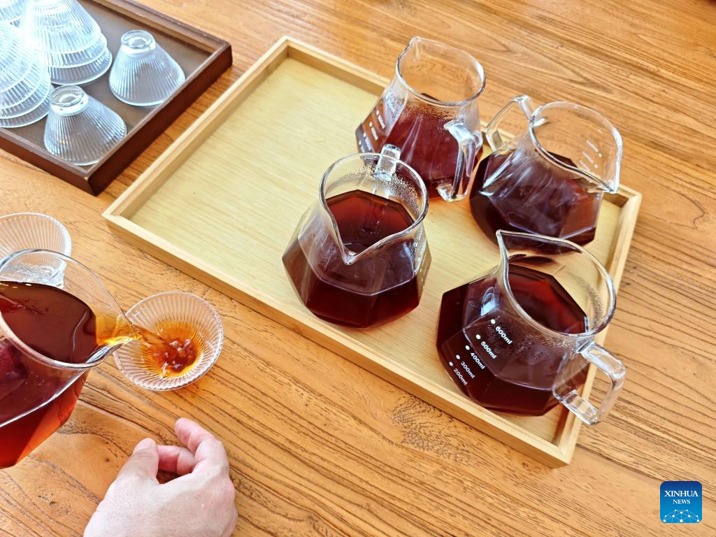 Visitors taste coffee in Nandaohe Village, Simao District, Pu'er City, southwest China's Yunnan Province, Sept. 20, 2025. The city of Pu'er along the China-Laos Railway has fully leveraged its coffee resources and natural landscapes to provide visitors with coffee-themed tourism experience, boosting local rural revitalization. (Xinhua/Xing Guangli)