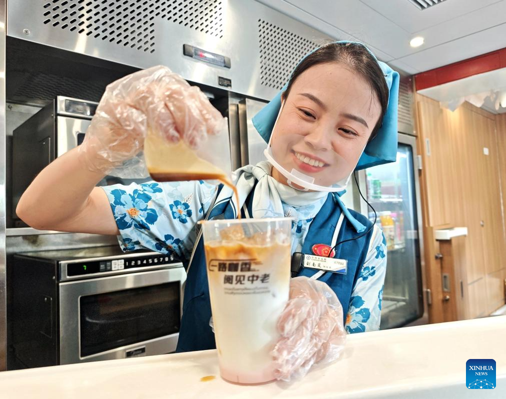 A staff member makes coffee on a train of the China-Laos Railway on Sept. 20, 2025. The city of Pu'er along the China-Laos Railway has fully leveraged its coffee resources and natural landscapes to provide visitors with coffee-themed tourism experience, boosting local rural revitalization. (Xinhua/Xing Guangli)