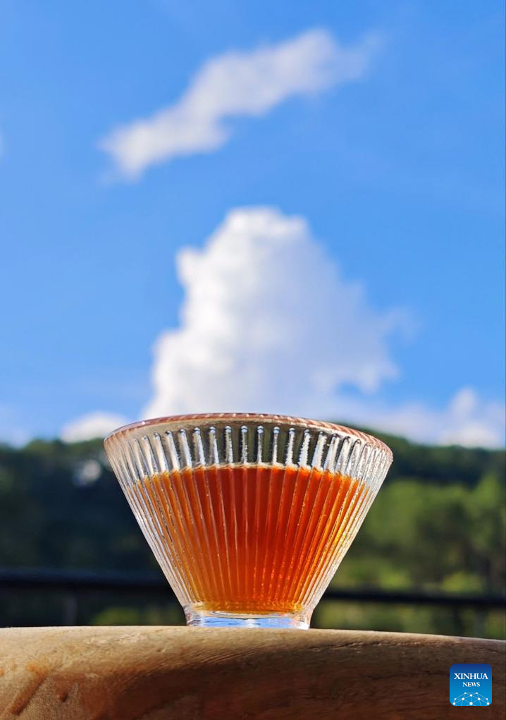 This photo taken on Sept. 20, 2025 shows a cup of coffee in Nandaohe Village, Simao District, Pu'er City, southwest China's Yunnan Province. The city of Pu'er along the China-Laos Railway has fully leveraged its coffee resources and natural landscapes to provide visitors with coffee-themed tourism experience, boosting local rural revitalization. (Xinhua/Xing Guangli)