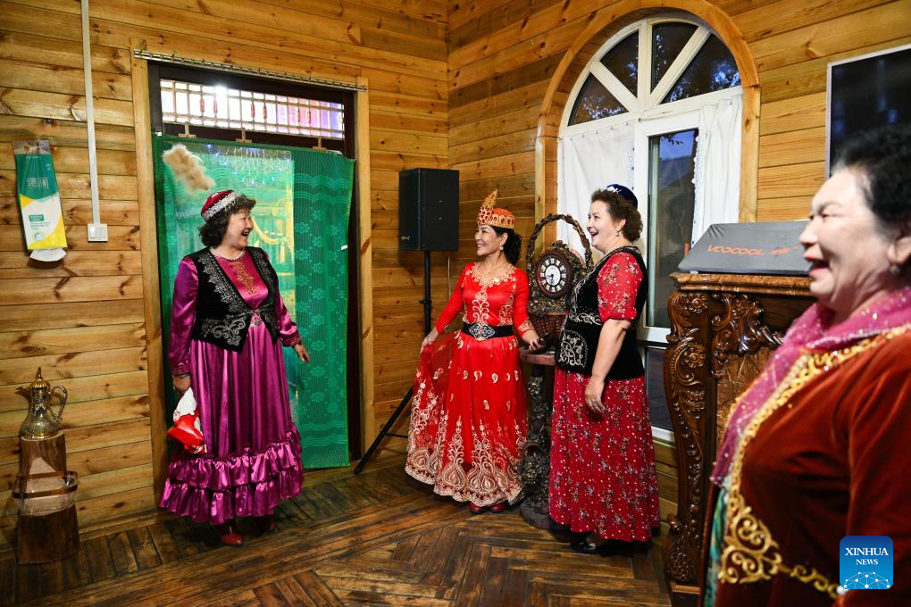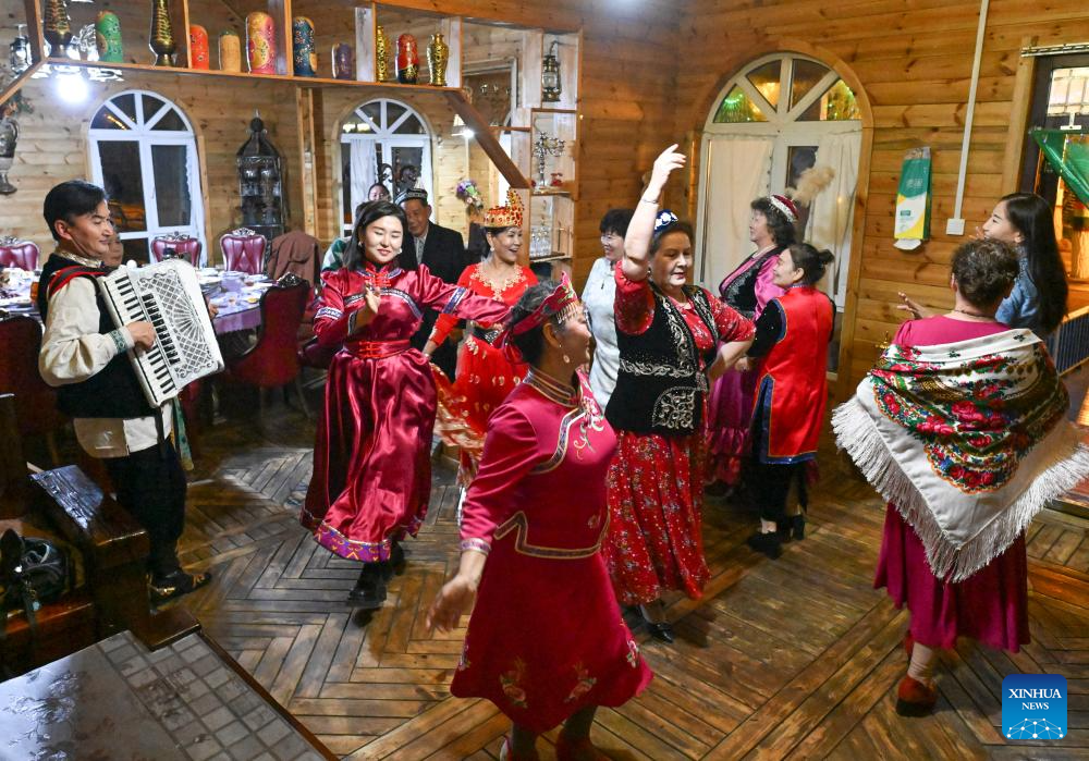 Guests dance after a meal at the agritainment of Ma Xiuhua in Tacheng City, northwest China's Xinjiang Uygur Autonomous Region, Sept. 17, 2025.(Xinhua/Wang Fei)