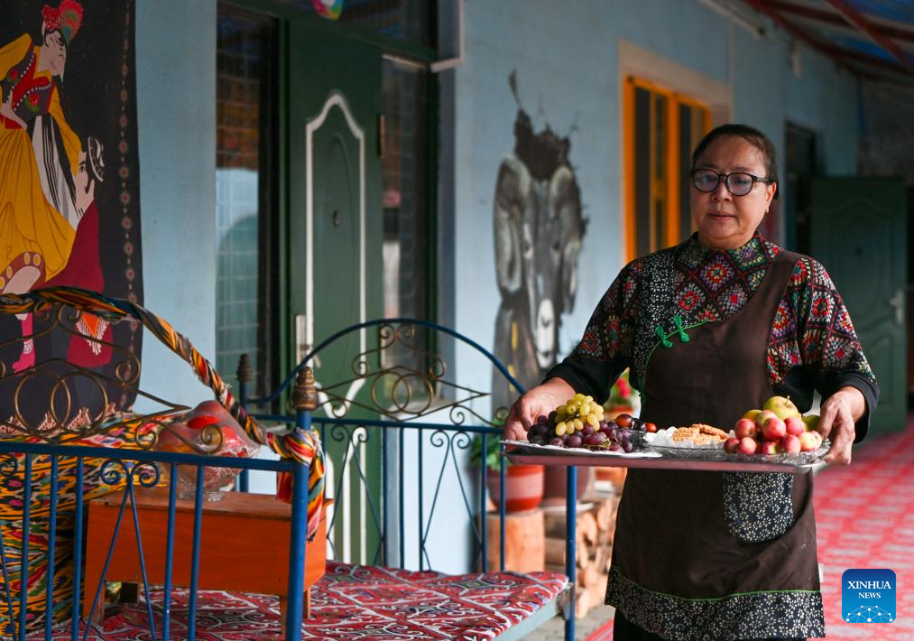Ma Xiuhua welcomes guests at her agritainment in Tacheng City, northwest China's Xinjiang Uygur Autonomous Region, Sept. 17, 2025.(Xinhua/Xin Yuewei)