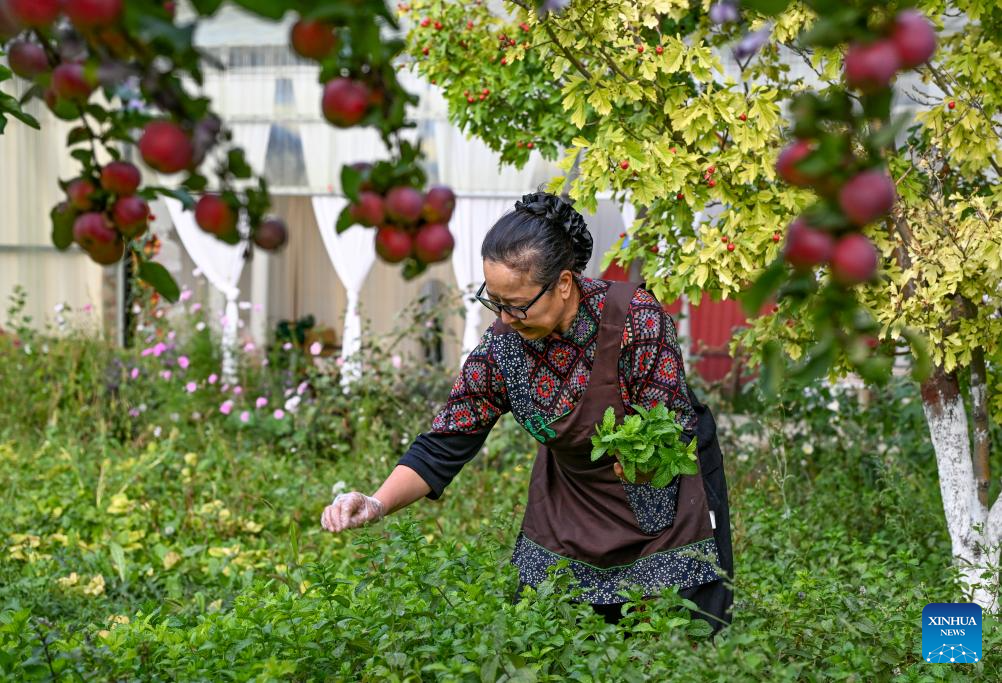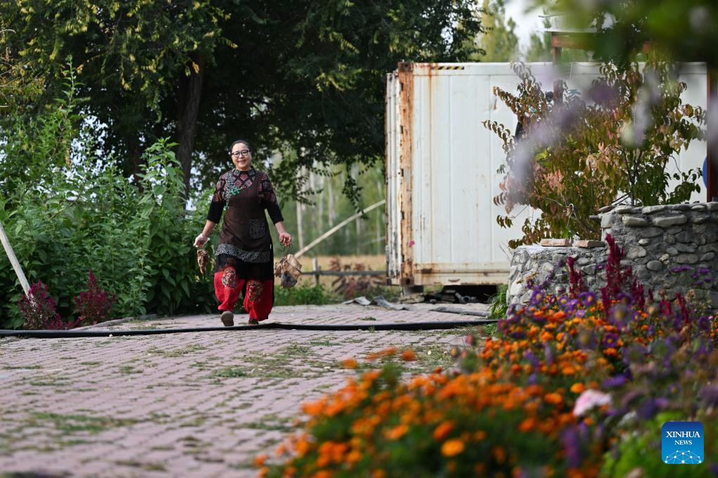 Ma Xiuhua works at her agritainment in Tacheng City, northwest China's Xinjiang Uygur Autonomous Region, Sept. 17, 2025.(Xinhua/Xin Yuewei)