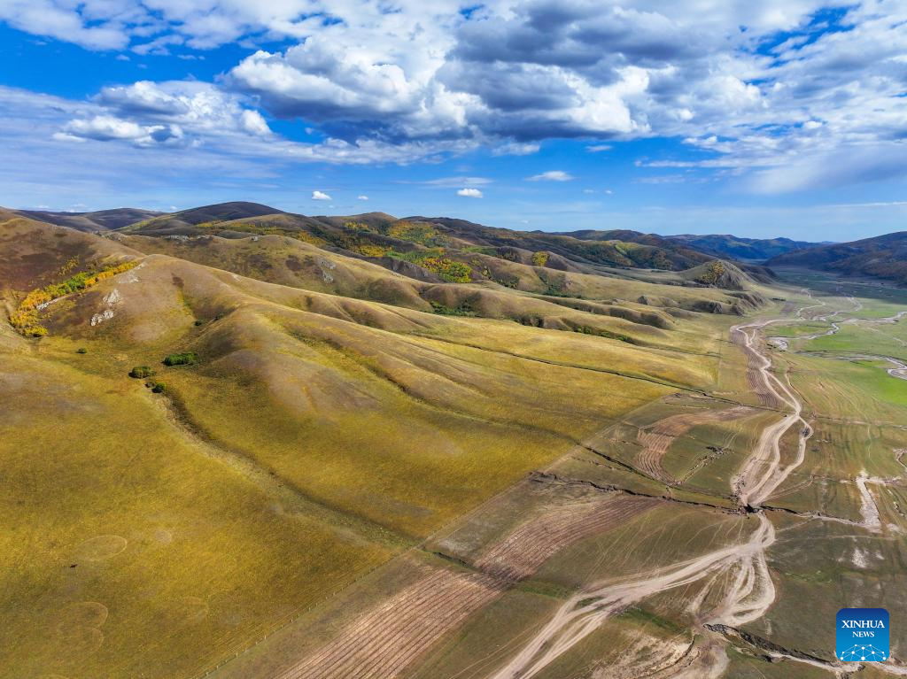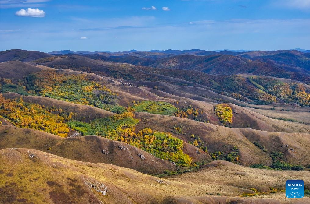 An aerial drone photo taken on Sept. 20, 2025 shows the autumn scenery of the Hanshan Mountain in Jarud Banner, Tongliao City of north China's Inner Mongolia Autonomous Region. Located in Jarud Banner of north China's Inner Mongolia Autonomous Region, the Hanshan Mountain national nature reserve was set up in 2013. Sitting in the south of the Greater Khingan Mountains, it serves as an ecological shelter and a water conservation area for the Horqin Grasslands. (Xinhua/Lian Zhen)