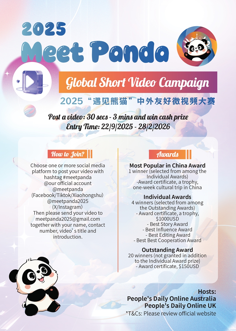 Jointly organized by People's Daily Online Australia and People's Daily Online UK, the 2025 “Meet Panda” Global Short Video Campaign will officially launch on Sept. 22, 2025, and run until Feb. 28, 2026, inviting submissions from creators worldwide.