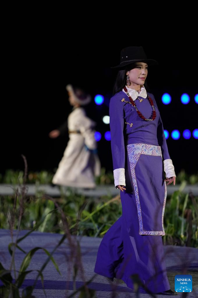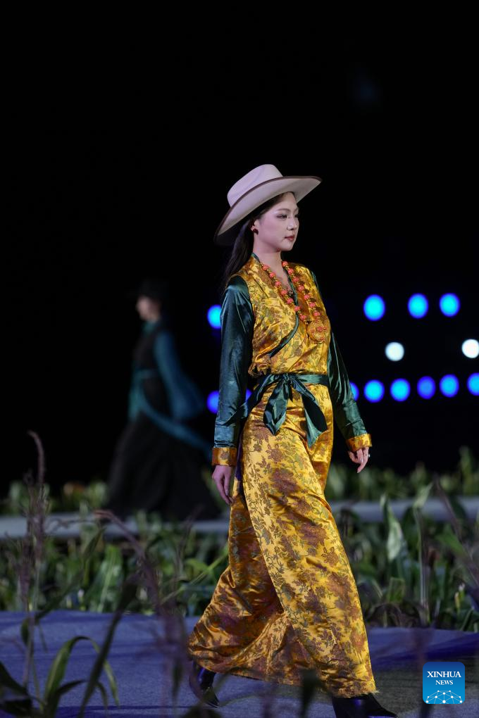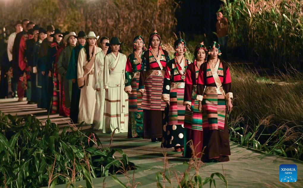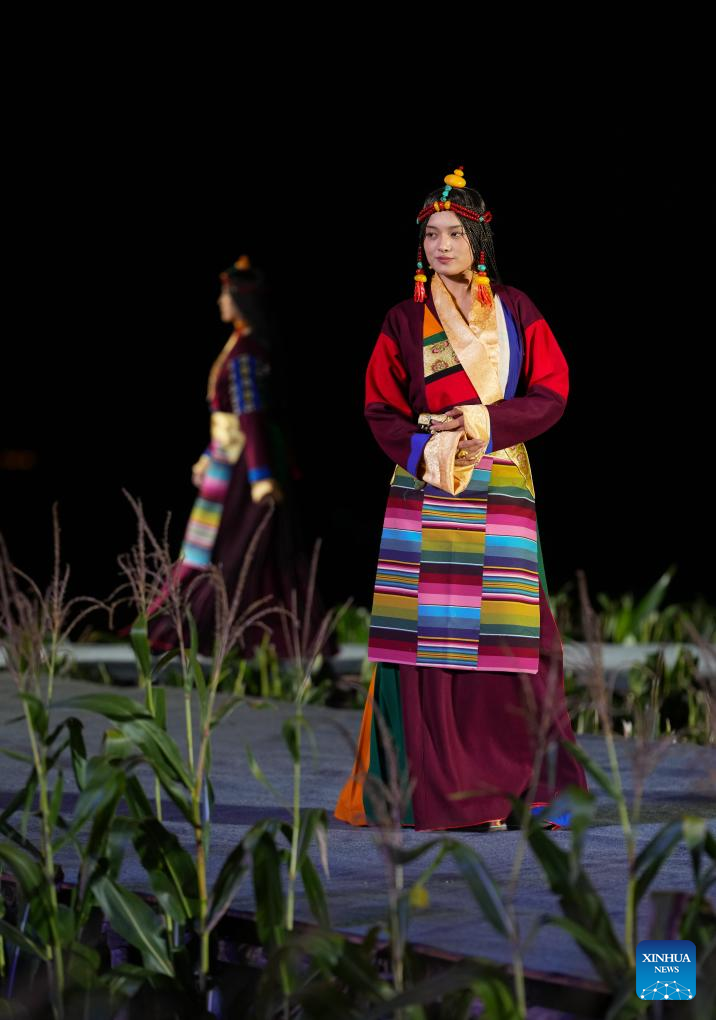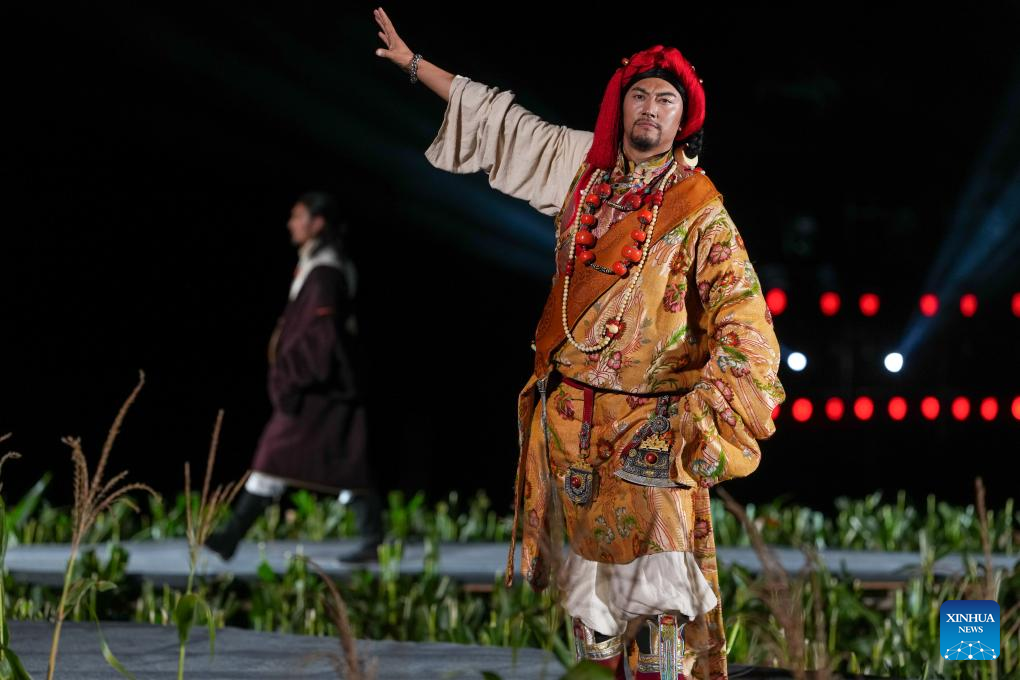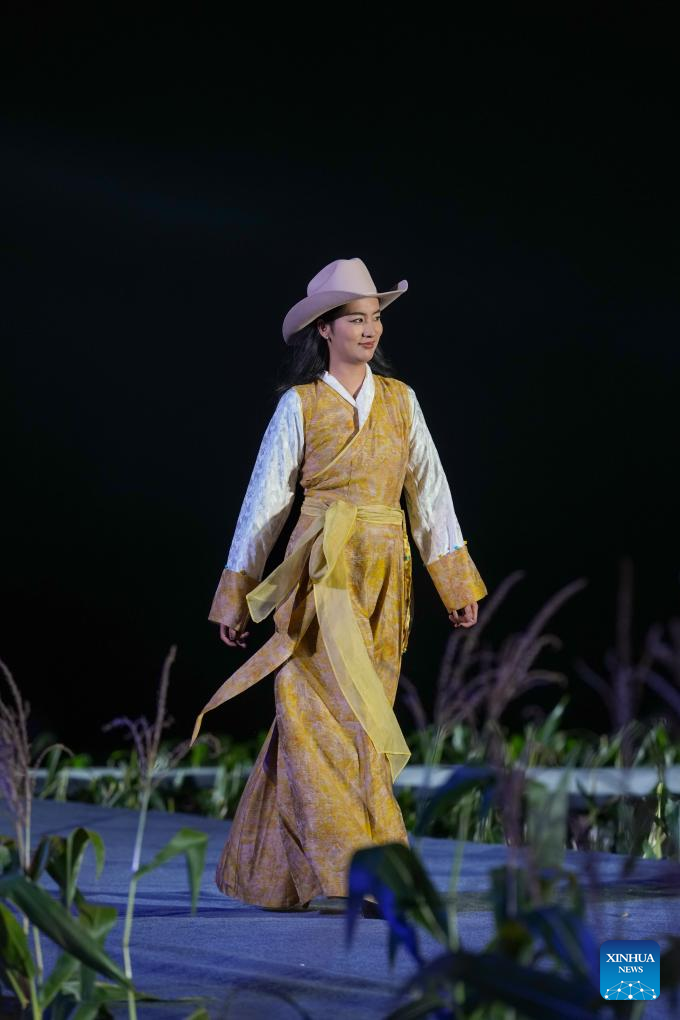 A Tibetan costume show is staged in Zhongde Village of Xiangcheng County, Ganzi Tibetan Autonomous Prefecture, southwest China's Sichuan Province, Sept. 20, 2025. A Tibetan costume show combining tradition and modernity was staged in the cornfield here on Saturday. (Xinhua/Jiang Hongjing)