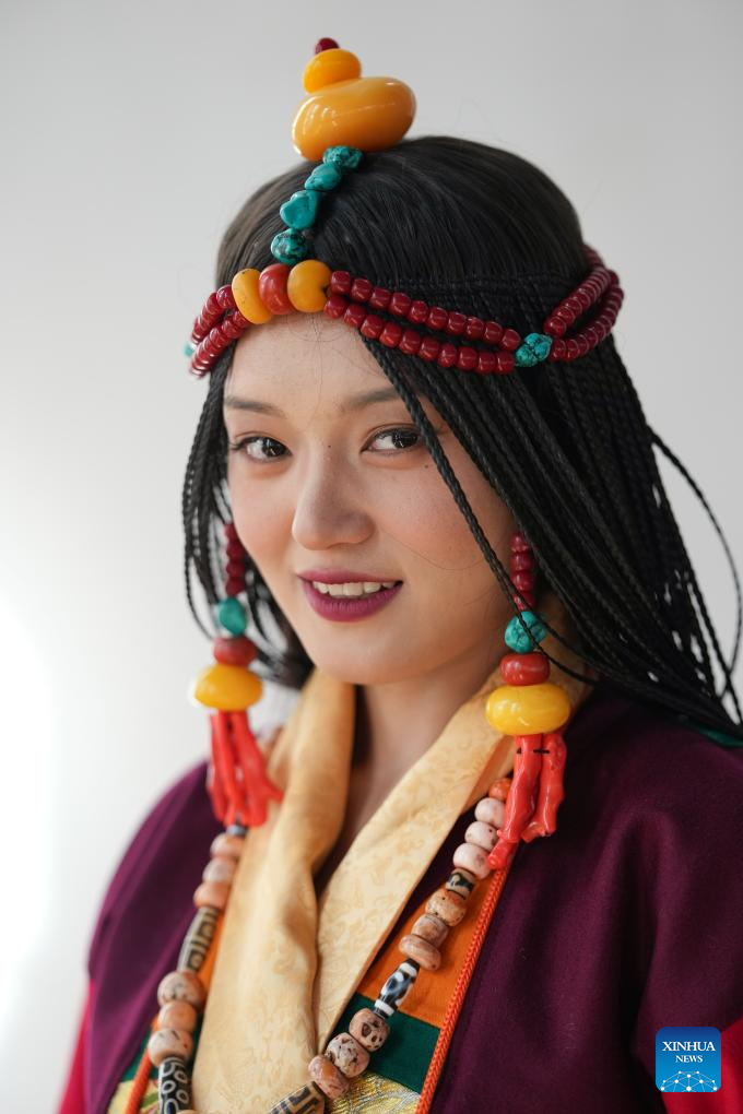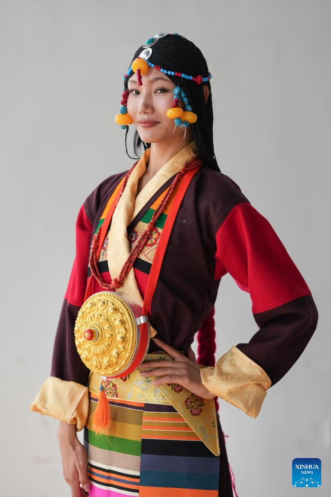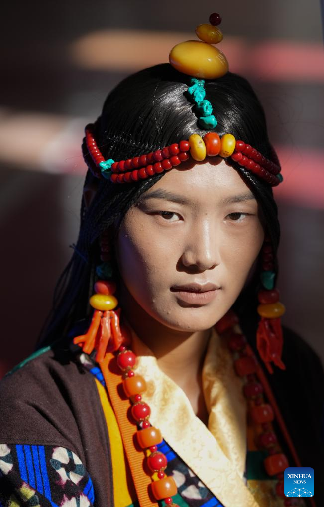 A woman presents traditional Tibetan costume before taking the stage at a Tibetan costume show in Zhongde Village of Xiangcheng County, Ganzi Tibetan Autonomous Prefecture, southwest China's Sichuan Province, Sept. 20, 2025. A Tibetan costume show combining tradition and modernity was staged in the cornfield here on Saturday. (Xinhua/Jiang Hongjing)