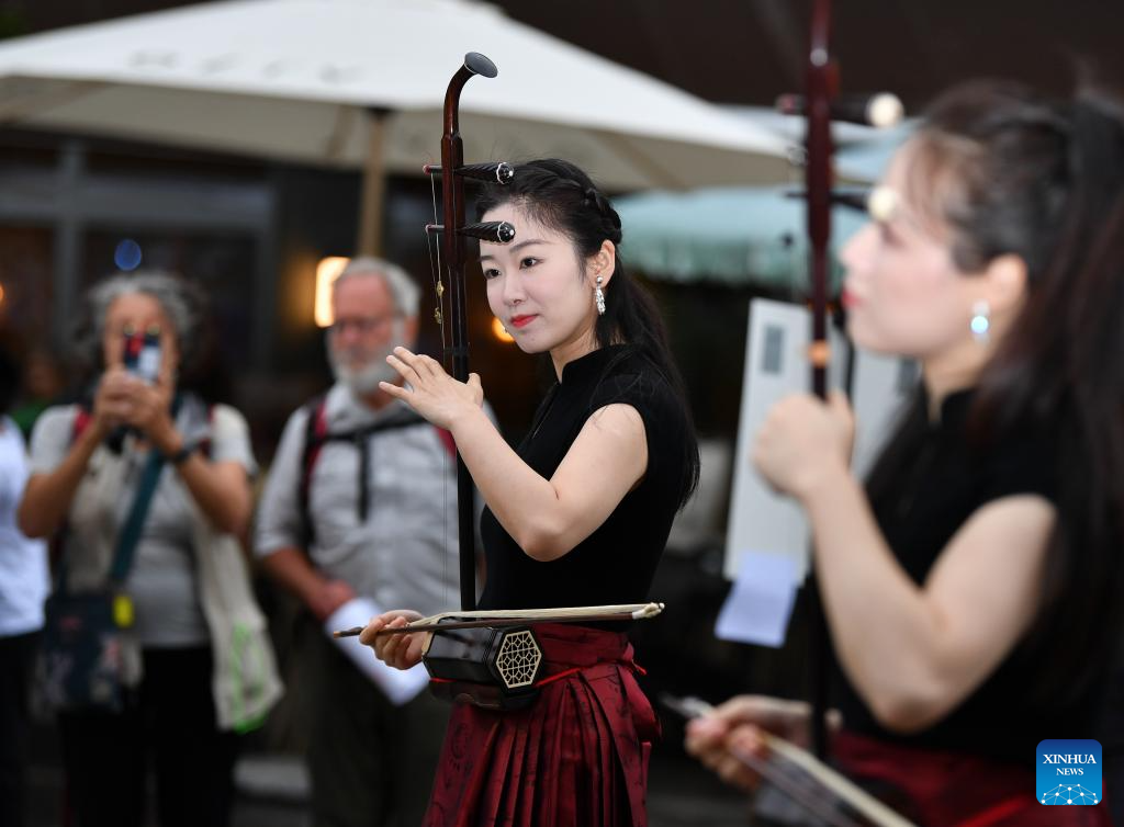 Artists perform traditional Chinese music during a "Hello! China" culture and tourism promotion event in Bern, Switzerland, Sept. 21, 2025. The event, hosted by the China Cultural Center in Bern, was held here on Sunday, featuring stage performances, including Taiji fan, traditional Chinese music and folk dances, as well as hands-on cultural experiences such as traditional Chinese medicine therapy, calligraphy, woodblock printing, sachets and handcrafted fans making. (Xinhua/Lian Yi)