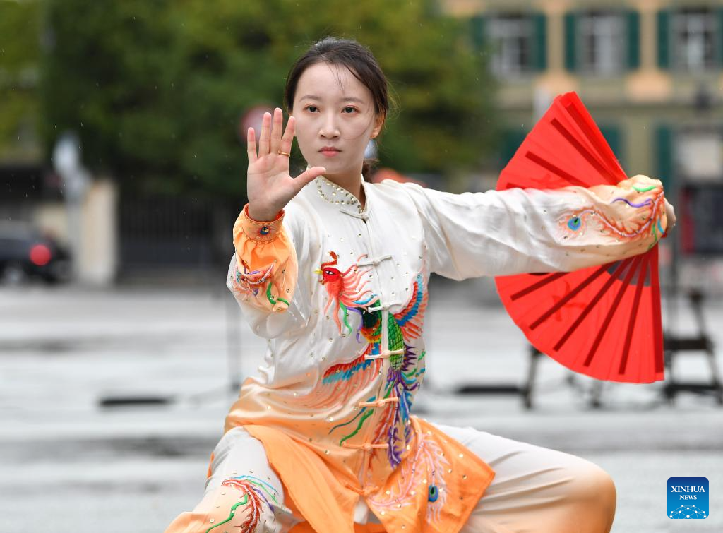 A performer performs Taiji fan during a "Hello! China" culture and tourism promotion event in Bern, Switzerland, Sept. 21, 2025. The event, hosted by the China Cultural Center in Bern, was held here on Sunday, featuring stage performances, including Taiji fan, traditional Chinese music and folk dances, as well as hands-on cultural experiences such as traditional Chinese medicine therapy, calligraphy, woodblock printing, sachets and handcrafted fans making. (Xinhua/Lian Yi)