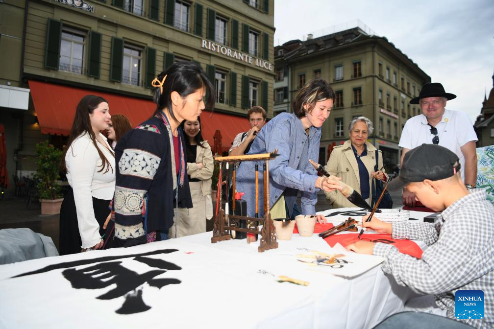 People try Chinese calligraphy during a "Hello! China" culture and tourism promotion event in Bern, Switzerland, Sept. 21, 2025. The event, hosted by the China Cultural Center in Bern, was held here on Sunday, featuring stage performances, including Taiji fan, traditional Chinese music and folk dances, as well as hands-on cultural experiences such as traditional Chinese medicine therapy, calligraphy, woodblock printing, sachets and handcrafted fans making. (Xinhua/Lian Yi)