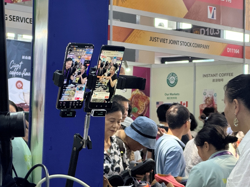 An exhibitor livestreams from his booth at the 22nd China-ASEAN Expo in Nanning, south China's Guangxi Zhuang Autonomous Region, showcasing products to online audiences, Sept. 20, 2025. (People's Daily Online/Wu Chaolan)