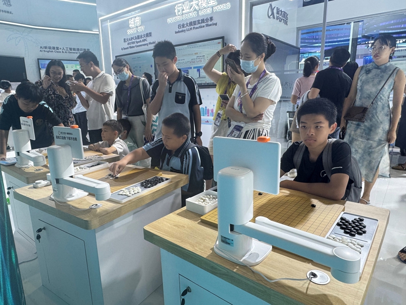 Visitors play Go with an AI-powered robot at the AI pavilion of the 22nd China-ASEAN Expo in Nanning, south China's Guangxi Zhuang Autonomous Region, Sept. 20, 2025. (People's Daily Online/Wu Chaolan)