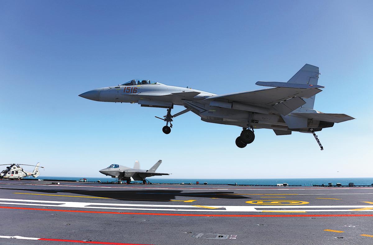 A KJ-600 early-warning and control plane lands on the aircraft carrier. PHOTO BY LI TANG / FOR CHINA DAILY
