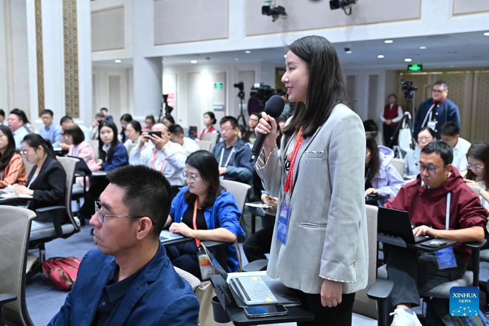 A journalist asks questions at a press conference held by the State Council Information Office (SCIO) on progress in accelerating the development of China into a leading country in education during the 14th Five-Year Plan period (2021-2025) in Beijing, capital of China, Sept. 23, 2025. (Xinhua/Li Xin)