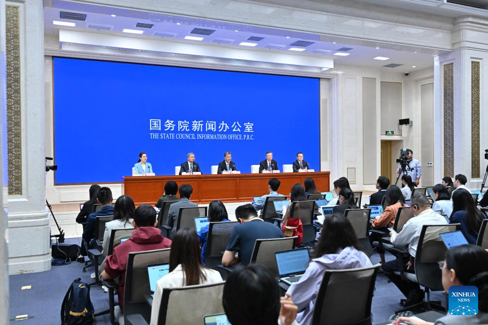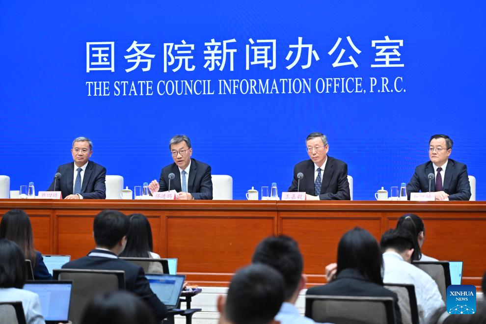 Chinese Minister of Education Huai Jinpeng, vice ministers of Education Wang Jiayi, Xiong Sihao and Du Jiangfeng attend a press conference held by the State Council Information Office (SCIO) on progress in accelerating the development of China into a leading country in education during the 14th Five-Year Plan period (2021-2025) in Beijing, capital of China, Sept. 23, 2025. (Xinhua/Li Xin)