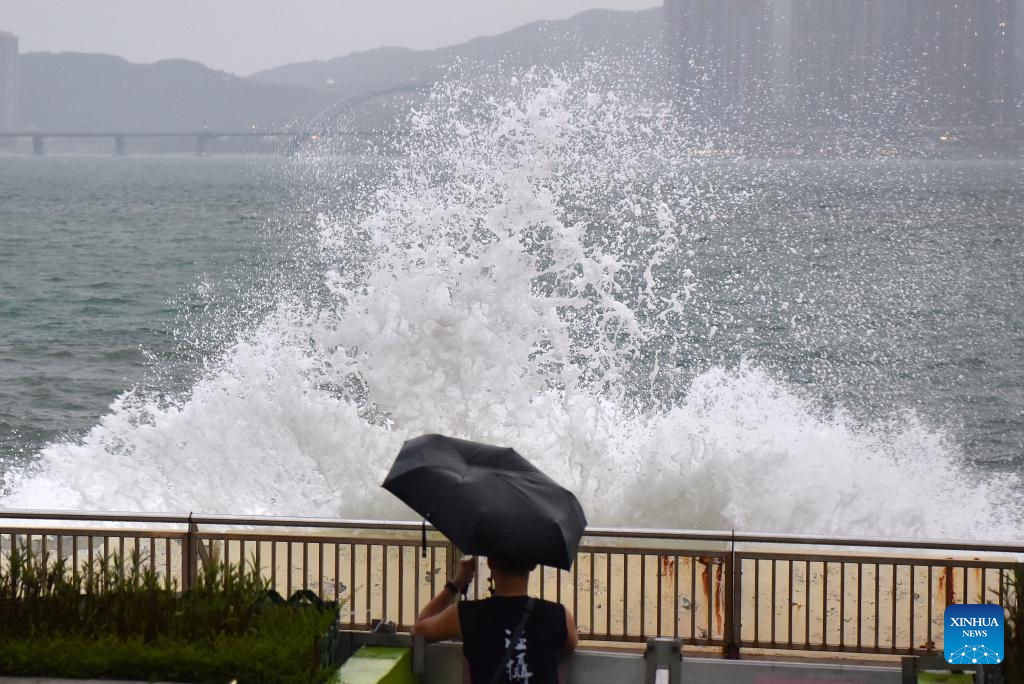 A man takes photos of a wave by a coast in Hong Kong, south China, Sept. 23, 2025. (Xinhua/Chen Duo)