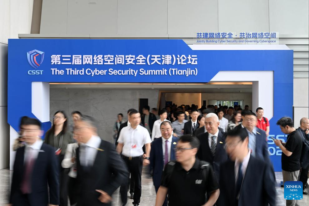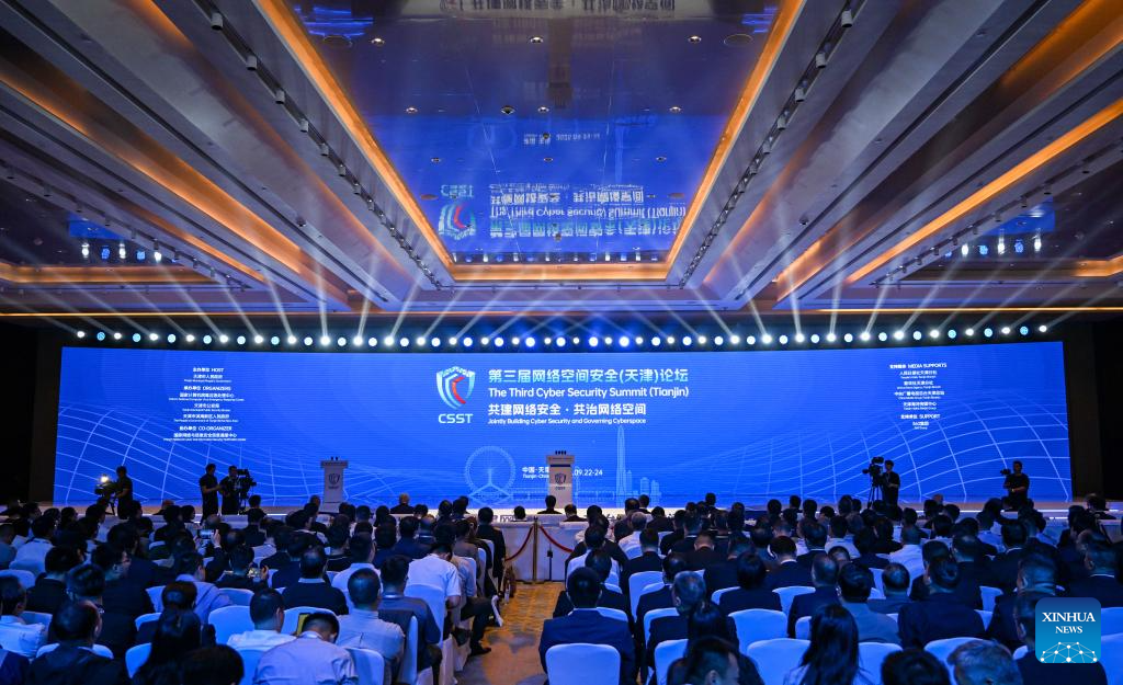 This photo taken on Sept. 23, 2025 shows the opening ceremony of the Third Cyber Security Summit (Tianjin) in north China's Tianjin. Themed "Jointly Building Cyber Security and Governing Cyberspace," the Third Cyber Security Summit (Tianjin) kicked off here on Tuesday. (Xinhua/Zhao Zishuo)