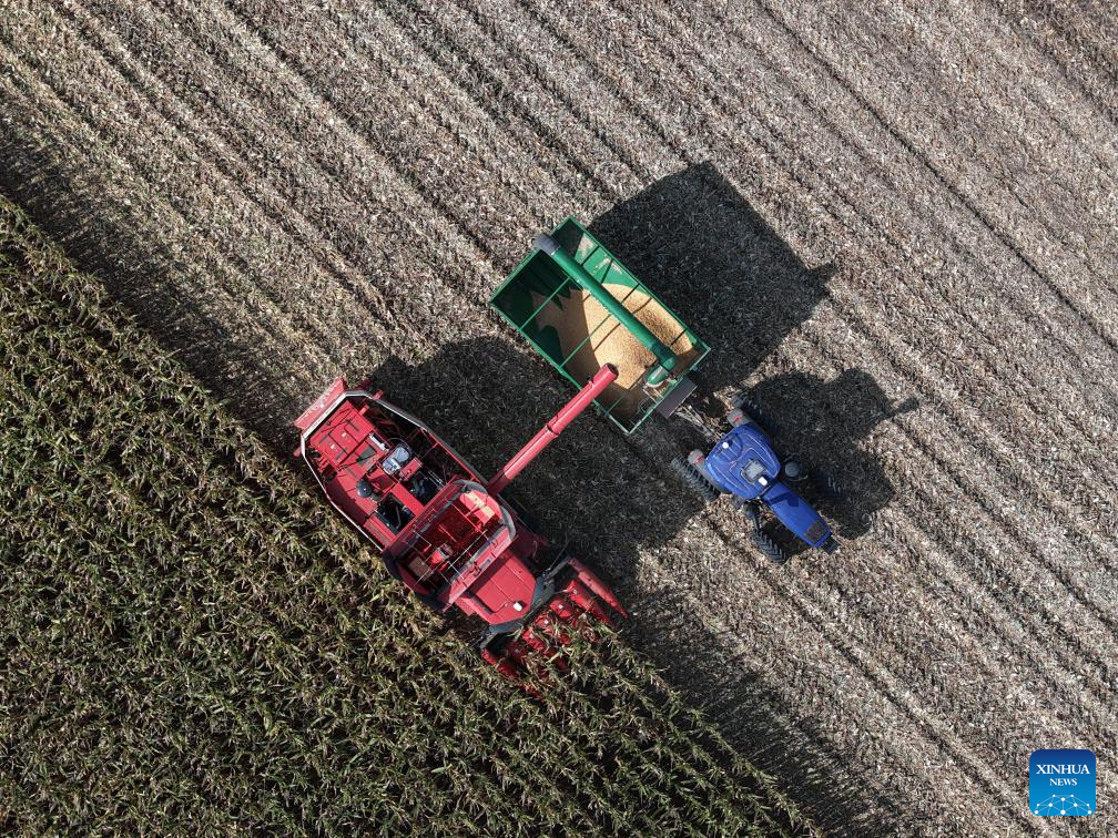 An aerial drone photo taken on Sept. 23, 2025 shows agricultural machinery harvesting corns in a field of a branch company of Heilongjiang Agriculture Company Limited, in northeast China's Heilongjiang Province. China's "grain barn" Heilongjiang has entered the autumn harvest season. (Xinhua/Wang Song)