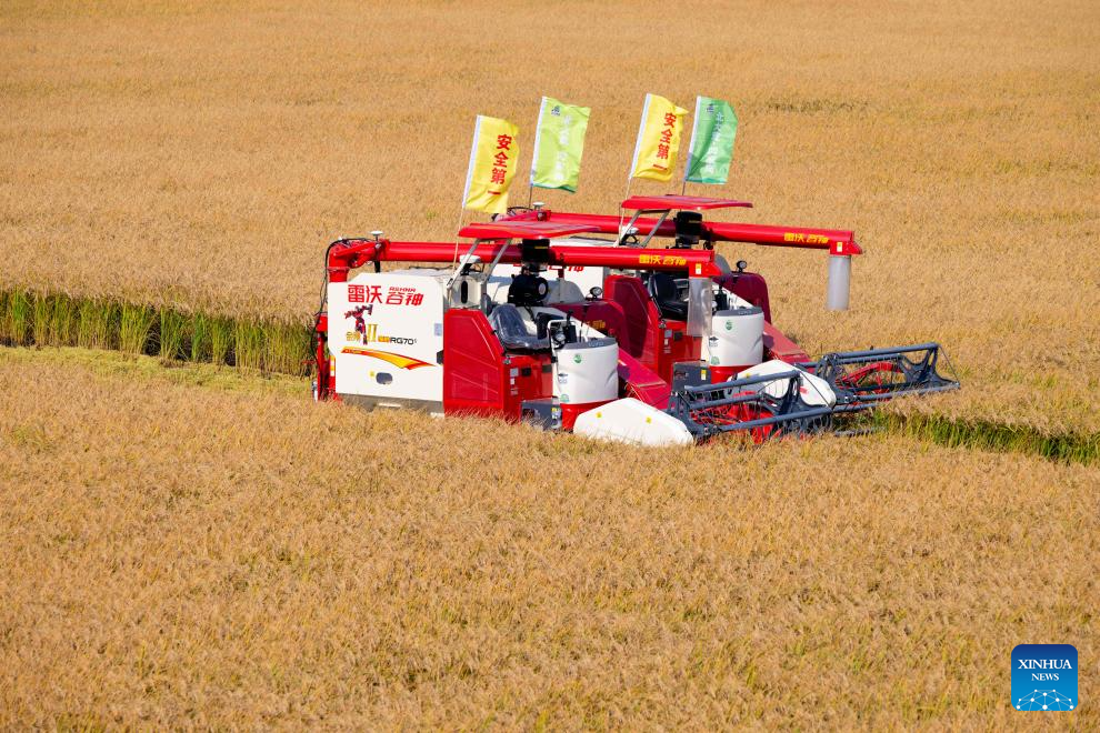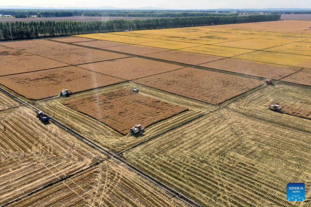 An aerial drone photo taken on Sept. 23, 2025 shows agricultural machinery harvesting paddy in a field of a branch company of Heilongjiang Agriculture Company Limited, in northeast China's Heilongjiang Province. China's "grain barn" Heilongjiang has entered the autumn harvest season. (Xinhua/Wang Song)