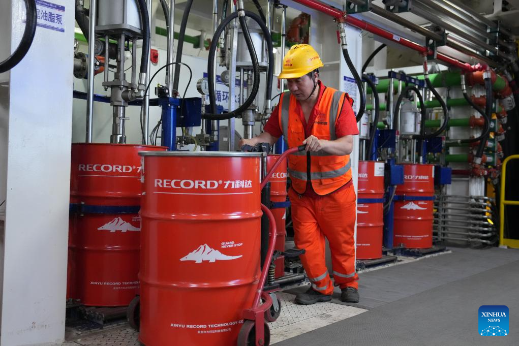 A worker replaces tail seal grease for "Yongzhou" tunnel boring machine at the construction site of Jintang undersea tunnel in east China's Zhejiang Province, Sept. 22, 2025. The self-developed tunnel boring machine "Yongzhou" achieved a tunneling mileage exceeding 2,470 meters on Monday at a depth of 65 meters below sea level of Jintang waterway between cities of Ningbo and Zhoushan in east China's Zhejiang Province. The milestone marks the completion of over half of the tunneling work in Ningbo section of Jintang undersea tunnel. (Xinhua/Huang Zongzhi)