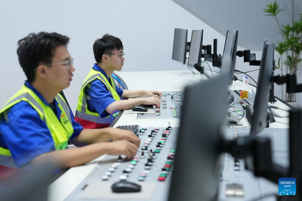 Technicians work at an operation room for "Yongzhou" tunnel boring machine at the construction site of Jintang undersea tunnel in east China's Zhejiang Province, Sept. 22, 2025. The self-developed tunnel boring machine "Yongzhou" achieved a tunneling mileage exceeding 2,470 meters on Monday at a depth of 65 meters below sea level of Jintang waterway between cities of Ningbo and Zhoushan in east China's Zhejiang Province. The milestone marks the completion of over half of the tunneling work in Ningbo section of Jintang undersea tunnel. (Xinhua/Huang Zongzhi)