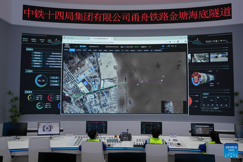 Technicians conduct remote construction management of Jintang undersea tunnel via a smart monitoring platform in Ningbo, east China's Zhejiang Province, Sept. 22, 2025. The self-developed tunnel boring machine "Yongzhou" achieved a tunneling mileage exceeding 2,470 meters on Monday at a depth of 65 meters below sea level of Jintang waterway between cities of Ningbo and Zhoushan in east China's Zhejiang Province. The milestone marks the completion of over half of the tunneling work in Ningbo section of Jintang undersea tunnel. (Xinhua/Huang Zongzhi)