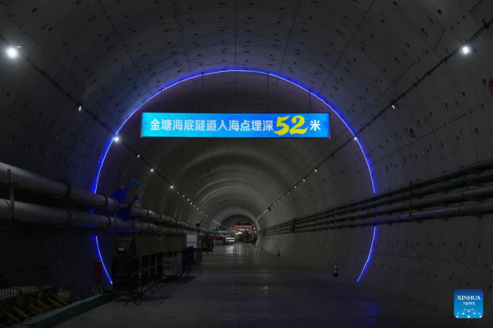 This photo shows the construction site of Jintang undersea tunnel at a depth of 52 meters below sea level in east China's Zhejiang Province, Sept. 22, 2025. The self-developed tunnel boring machine "Yongzhou" achieved a tunneling mileage exceeding 2,470 meters on Monday at a depth of 65 meters below sea level of Jintang waterway between cities of Ningbo and Zhoushan in east China's Zhejiang Province. The milestone marks the completion of over half of the tunneling work in Ningbo section of Jintang undersea tunnel. (Xinhua/Huang Zongzhi)