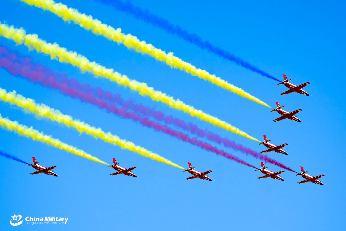 K-8 mediate trainer jets attached to the Red Falcon Aerobatic Team of the Aviation University of the Chinese PLA Air Force emit colored smoke during the 2025 aviation open-day activities of the Chinese PLA Air Force and Changchun Air Show in Changchun City, northeast China's Jilin Province, on September 21, 2025. (eng.chinamil.com.cn/Photo by Xu Dong)
